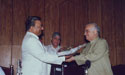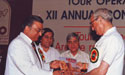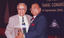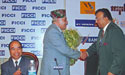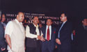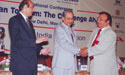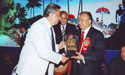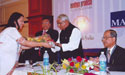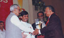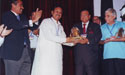 H.E. Mr. Bhairon Singh Shekhawat (Former Vice-President of India) presenting the Gold award to Dr. Subhash Goyal (Chairman - Stic Travels Group) on behalf of Ministry of Commerce, FIEO and Mr. Shahnawaz Hussain (former union Minister of Civil Aviation) in the middle
