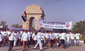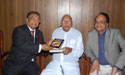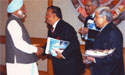 (From left to right) Dr. Subhash Goyal (President - Indian Association of Tour Operators) Presenting Cheque of Rs.5 Lakhs for Tsusnami relief fund to H.E Dr. Manmohan Singh (Hon'ble Prime Minister of India).